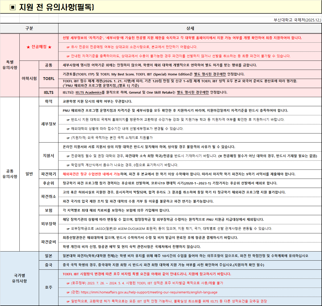 9학기 서약서 | 2026-2학기가 최후 학기(일반학과인 경우 8학기 차)인 지원자의 경우, 귀국 후 추가로 한 학기 이상을 부산대에서 수학해야 하므로 지원 시 ‘9학기 서약서’ 필수 제출 |