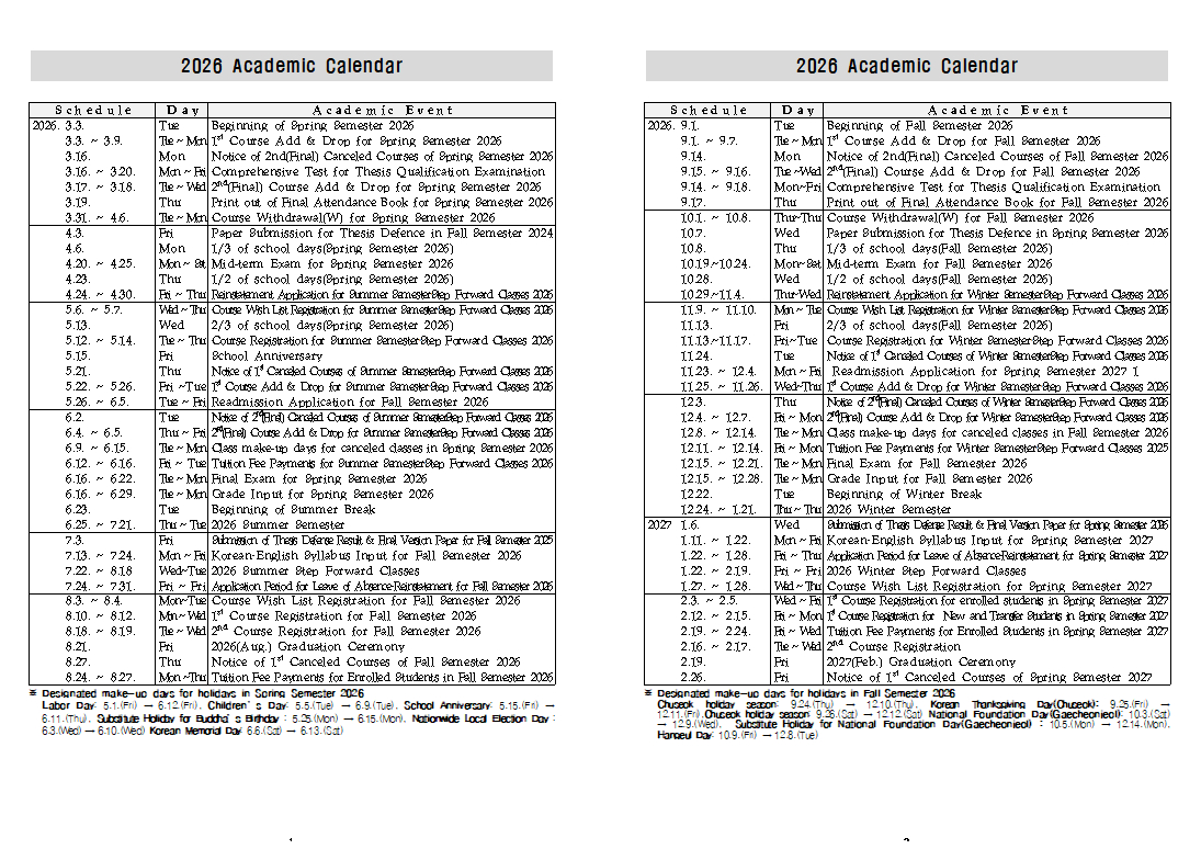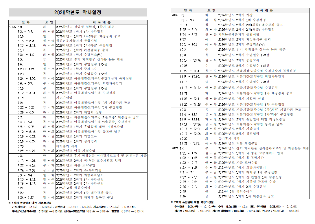 fnctId=bbs,fnctNo=2630 [학사] 2026학년도 학사일정 / 2026 Academic Calendar date 2025.11.17 name 장진영 e-mail view 81 첨부파일 251105_2026학년도 학사일정 및 학사력.pdf 미리보기 2026년 학사일정 및 학사력(ENG).pdf 미리보기